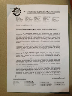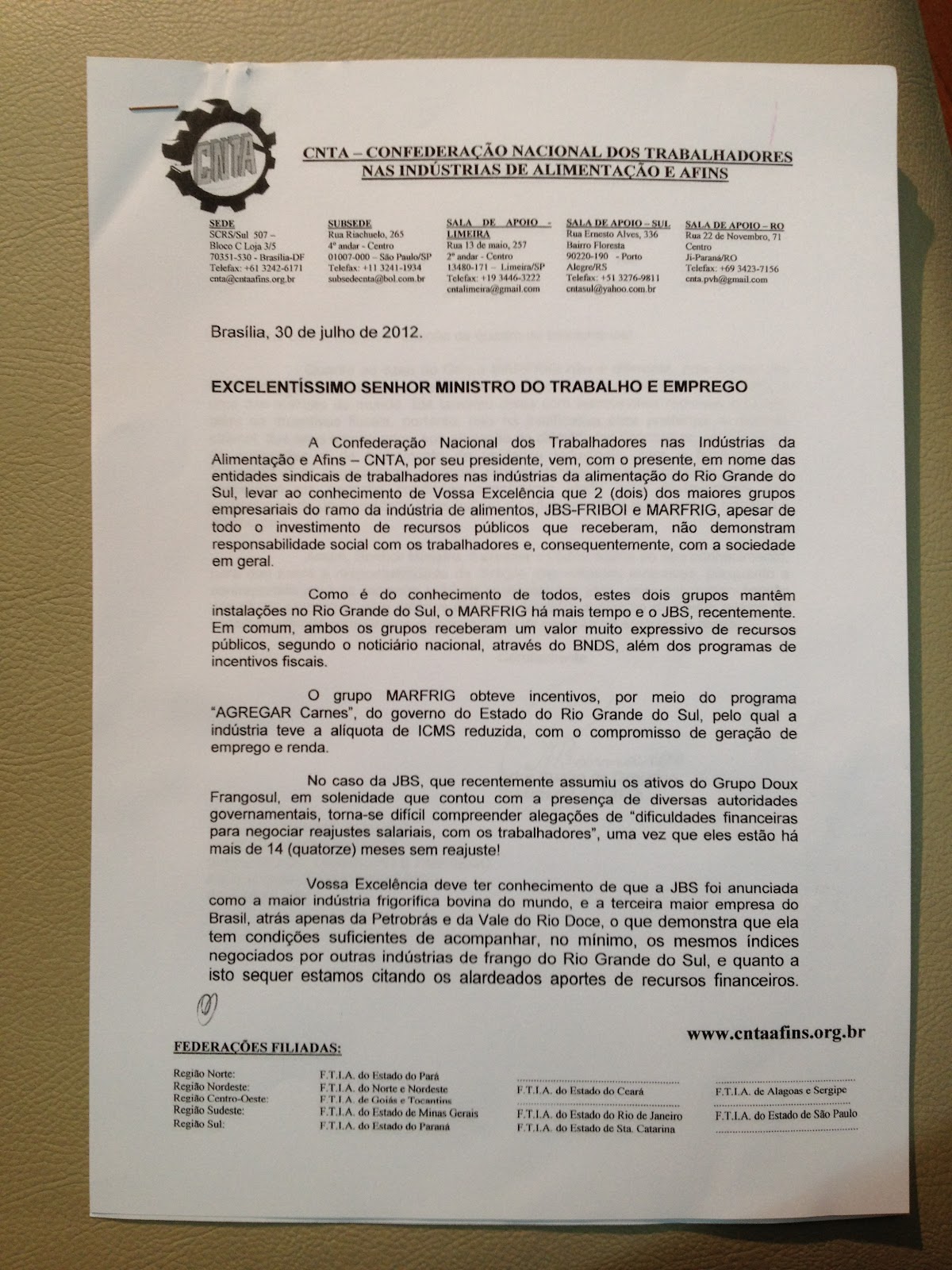 Ao fim da audiência, a CNTA aproveitou o encontro para entregar ao ministro, um ofício que denuncia as más condições de trabalho no setor frigorífico e práticas abusivas das empresas Marfrig e JBS Friboi no Rio Grande do Sul (RS). De acordo com a confederação, os dois maiores grupos do ramo da indústria de alimentos não demonstram responsabilidade social em contra partida do recebimento de investimentos de recursos públicos, por meio do  Banco Nacional de Desenvolvimento (BNDES) e programas de incentivos fiscais locais.