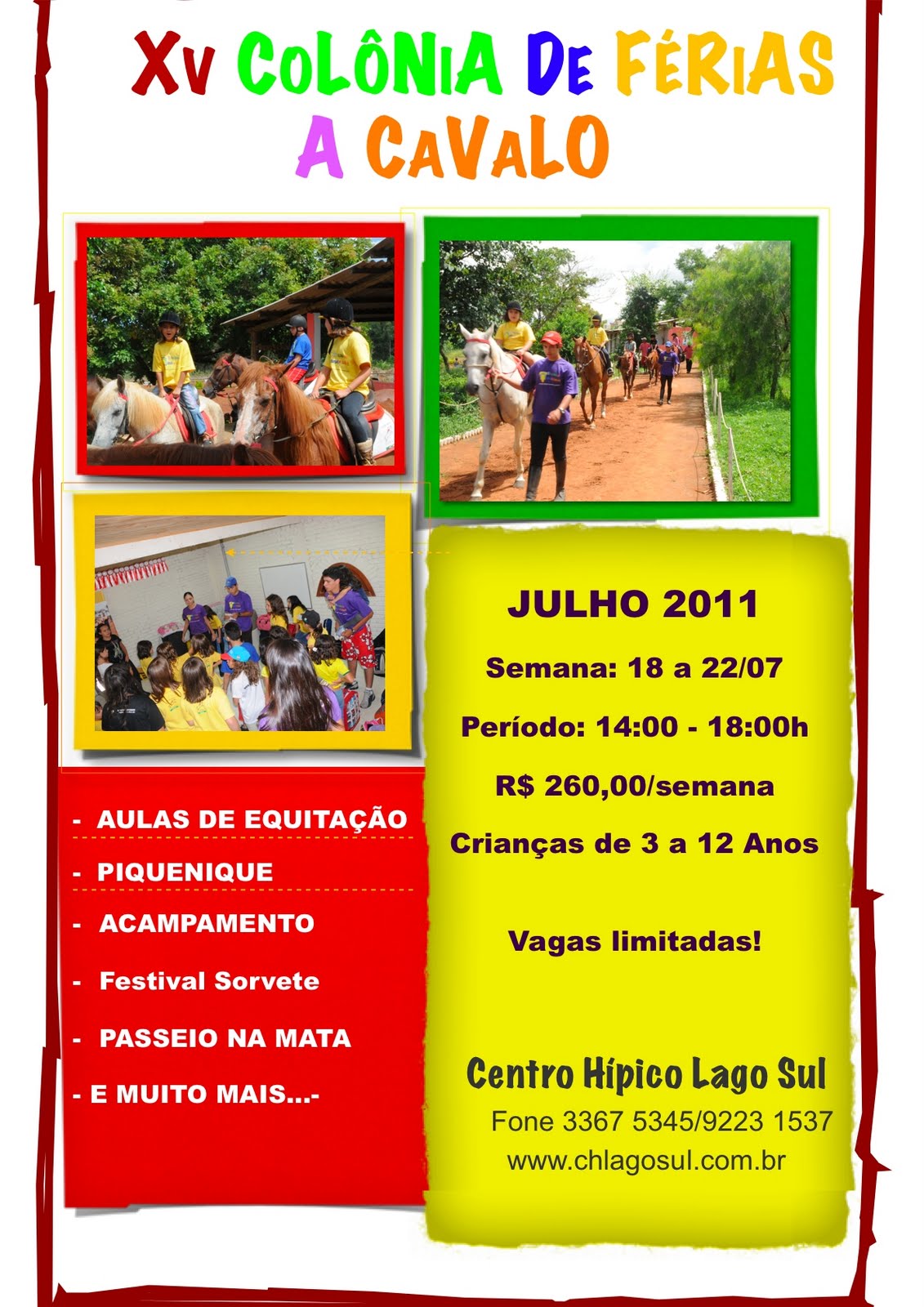 Na folga dos estudos, crianças e adolescentes de Brasília terão uma opção diferente e saudável para se divertir nessas férias. O Centro Hípico Lago Sul irá realizar na semana do dia 18 ao 29 a XVI Colônia de Férias a Cavalo. O objetivo é aproximar o contato de meninos e meninas entre 3 e 14 anos com a natureza e os animais a partir de brincadeiras e aulas de equitação. Além disso, a criançada poderá participar de atividades como acampamento, campeonato de futebol de sabão, trilha na mata e o concorrido festival de sorvete.
