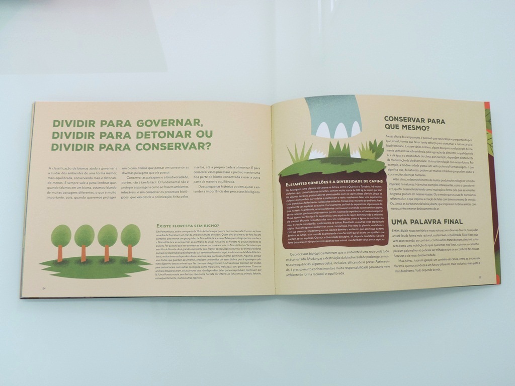 “Isso é uma coisa muito interesse. Muitas vezes há a percepção de que um bioma florestal é um bioma que vale a pena ser conservado em detrimento de outros, como o Cerrado (que possui a savana com maior diversidade arbórea do planeta) e o Pampa, que não têm a mesma exuberância visual que a Mata Atlântica ou Amazônia têm. Mas os processos da natureza acontecem em todos esses biomas e todos eles precisam ser conservados para assegurar a manutenção desses processos que, em ultima instância, é o que garante a manutenção da vida na Terra e da qualidade da vida humana também.”, alerta Bensusan, que também destaca os ecossistemas marinhos e costeiros em seu sexto título infantil.