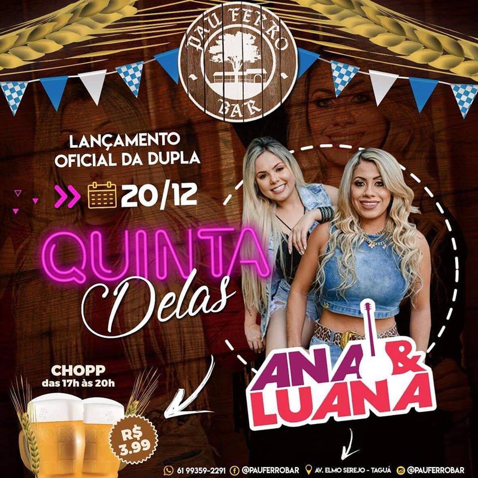 A renovação de artistas na música sertaneja tem revelado grandes talentos e contribuído cada vez mais com a inserção das mulheres no gênero musical. Em Brasília não é diferente. A dupla Ana e Luana, de Mato Grosso, chega para retomar o espaço das duplas femininas nas principais casas noturnas e bares da cidade. As loiras irão inaugurar o projeto nesta quinta (20/12), com show exclusivo no novíssimo Pau Ferro Bar, em Taguatinga. A casa abre às 18h.