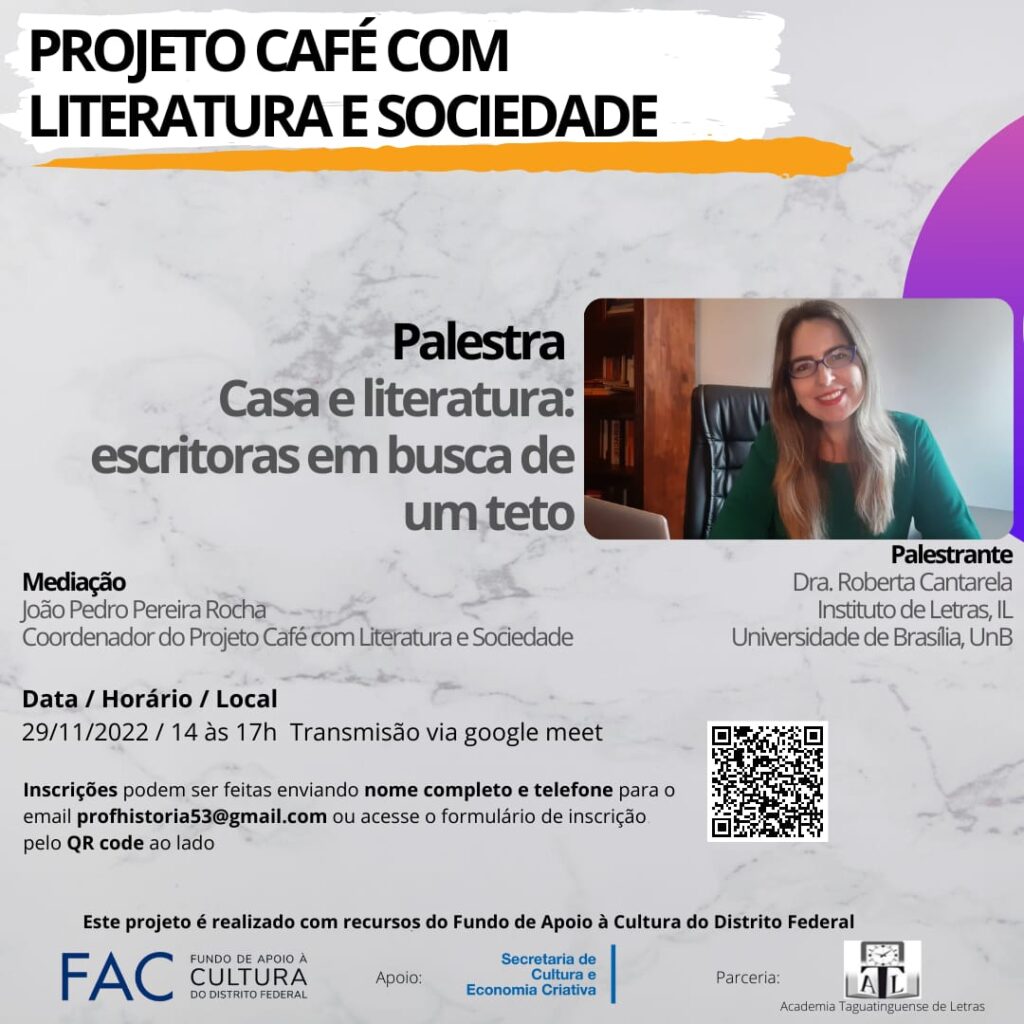 O projeto Café com Literatura e Sociedade realizará, no próximo dia 29, das 14h às 17h, a palestra Casa e literatura: escritoras em busca de um teto, ministrada pela professora Roberta Cantarela, do Programa de Pós-Graduação em Literatura do Instituto de Letras da Universidade de Brasília (UnB). A mediação será feita pelo coordenador do projeto, o professor e produtor cultural João Pedro Pereira Rocha, mestre em História pela Universidade Federal de Catalão. O evento será transmitido via Google Meet. Os interessados devem se inscrever gratuitamente, enviando o nome completo e o telefone para o e-mail: profhistoria53@gmail.com . O projeto é apoiado pelo Fundo de Apoio à Cultura (FAC/DF) e pela Academia Taguatinguense de Letras (ATL).